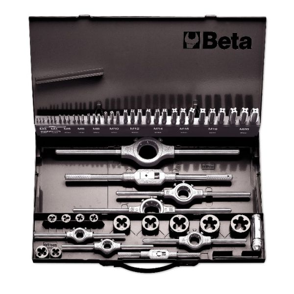 Assortiment van HSS tappen en snijplaten, metrische draad, met toebehoren in metalen kist