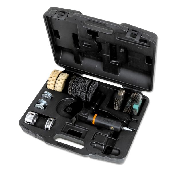 schuur- en polijstmachine met 2 rubberen wielen, 2 grove korrel, 2 fijne korrel borstels, 6 schuurschijven en 4 adapters in koffer